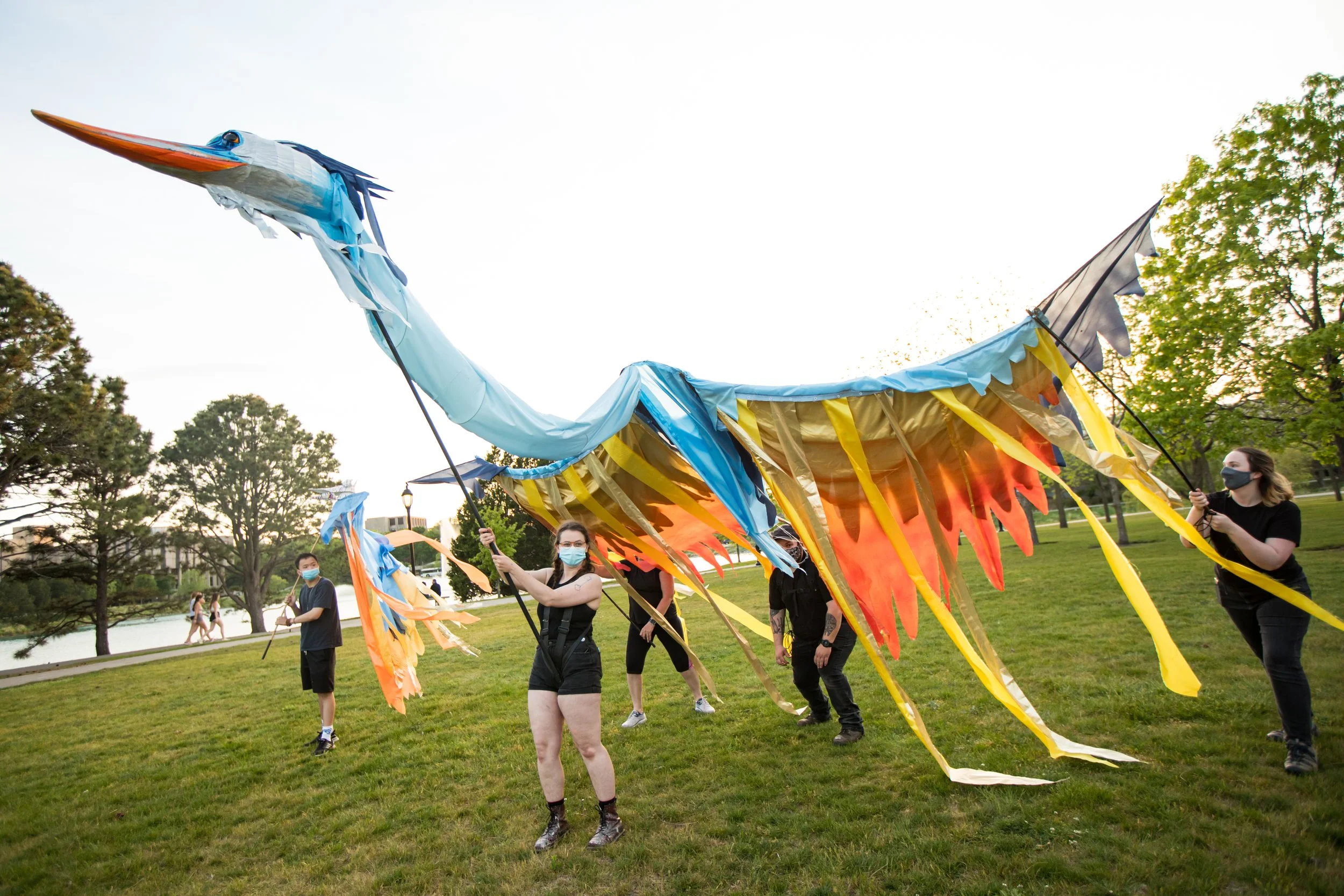 Flight of the Phoenix was created in collaboration with MFA students and faculty Jessica Thebus and Dassia Posner as a way of gathering in a large public spectacle of renewal and life. There were five large bird puppets designed and fabricated by MFA Designers. Nora was the “Bird Design Captain” and facilitated the process as well as designed the 20 smaller bird puppets built by undergraduate students and her own 18’ Blue Heron Puppet. Each bird was modeled on local bird populations, mirroring Nora’s interest in ornithology. As the bird took flight, they converged in a circle and met an enormous dragon puppet, where they transformed into fire colors and made their way across Northwestern Campus. Local community members were invited to this family friendly outdoor event in June 2020.